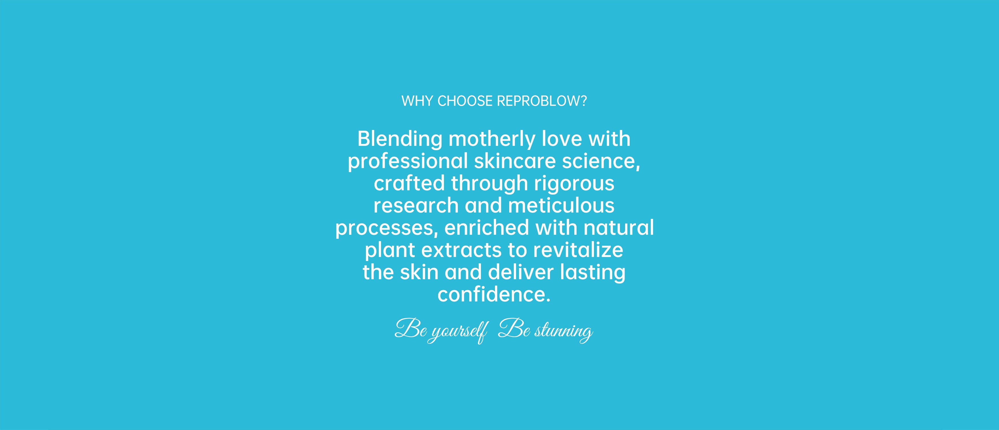 We firmly believe that every user, every customer, and every person longing for beautiful skin is the "daughter" in our hearts. Our brand philosophy originates from a mother's selfless love and deep care for her daughter, Cherry. When faced with her daughter's dullness and acne caused by climate changes, she embarked on a journey to find a solution without hesitation.She traveled through mountains and glaciers, uncovering nature’s treasures. Collaborating with skincare scientists, she conducted over 3,000 experiments to create a range of skincare products specially designed for Southeast Asia’s climate. Every REPROBLOW product is a perfect fusion of nature and science, aimed at helping every "daughter" regain confidence and radiance.